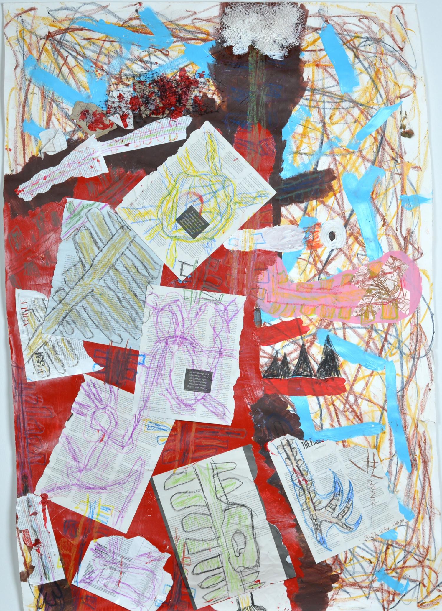 Acrylic, Magazine Paper, and Oil Stick on Paper