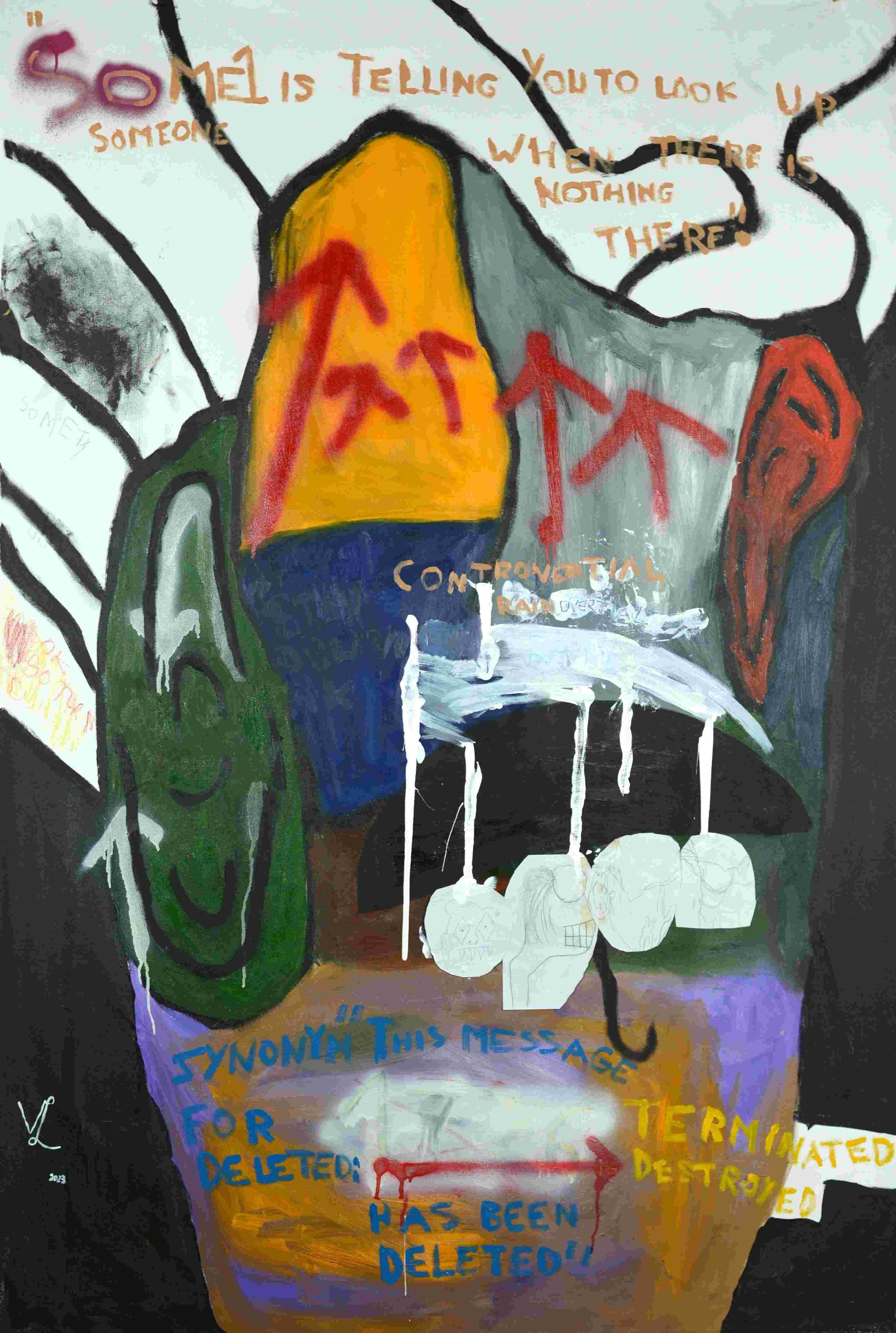 Oil, Paper, and Spray-paint on Canvas